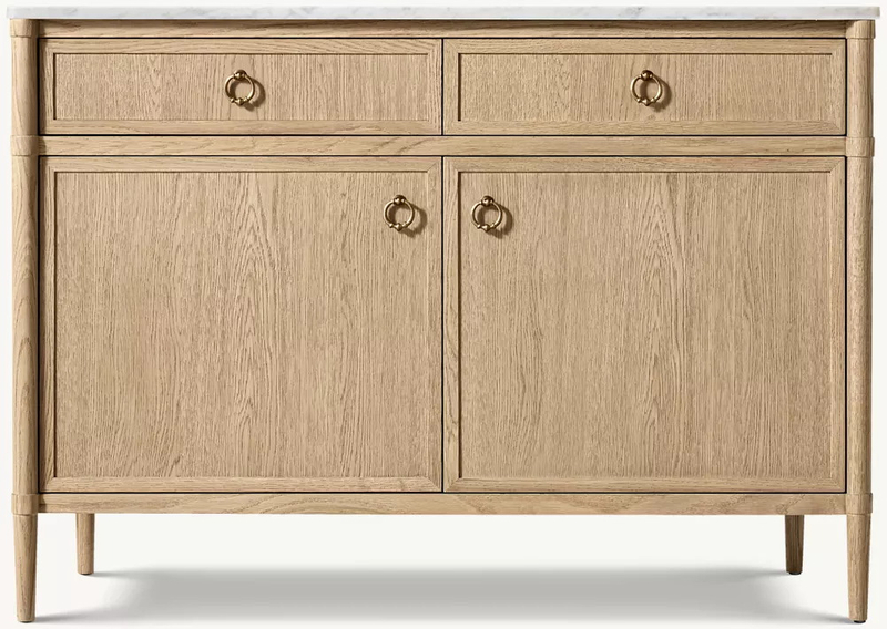 Característica decorativa: Cada aparador é dotado de 'singularidade' pela sua textura natural. A combinação de puxadores retrô e linhas simples faz com que não seja apenas uma peça de armazenamento, mas também um ponto focal visual (a bancada pode conter itens decorativos).