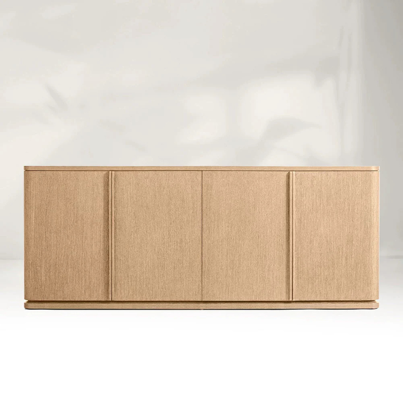 Este armário de jantar de madeira de cor clara se integra perfeitamente ao espaço com um estilo minimalista. A textura de madeira clara é simples e natural, transmitindo uma sensação quente e suave. Os quatro painéis de portas planos, combinados com um design incorporado, apresentam uma aparência sem escala que incorpora a estética minimalista. A base flutuante inferior acrescenta uma sensação de leveza. O interior do gabinete pode ser organizado com flexibilidade para armazenamento. Seja usado para armazenar utensílios de mesa e eletrodomésticos na área de jantar, movida para a sala de estar para exibir livros e coleções ou colocada na entrada para armazenar itens diários, pode cumprir o papel de um 'goleiro de ordem silenciosa' no espaço. Com sua forma simples e funções práticas, ele pode criar uma atmosfera confortável e elegante em casa, usando materiais naturais e linhas limpas para aprimorar o ambiente de vida.