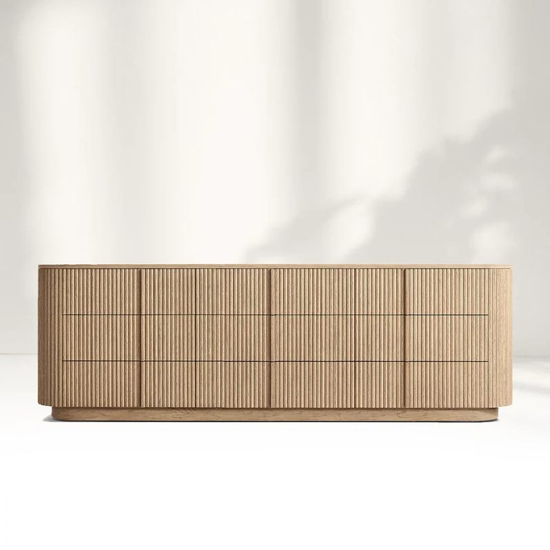 As superfícies verticais possuem palheta de carvalho sólido, adicionando profundidade e textura à peça.