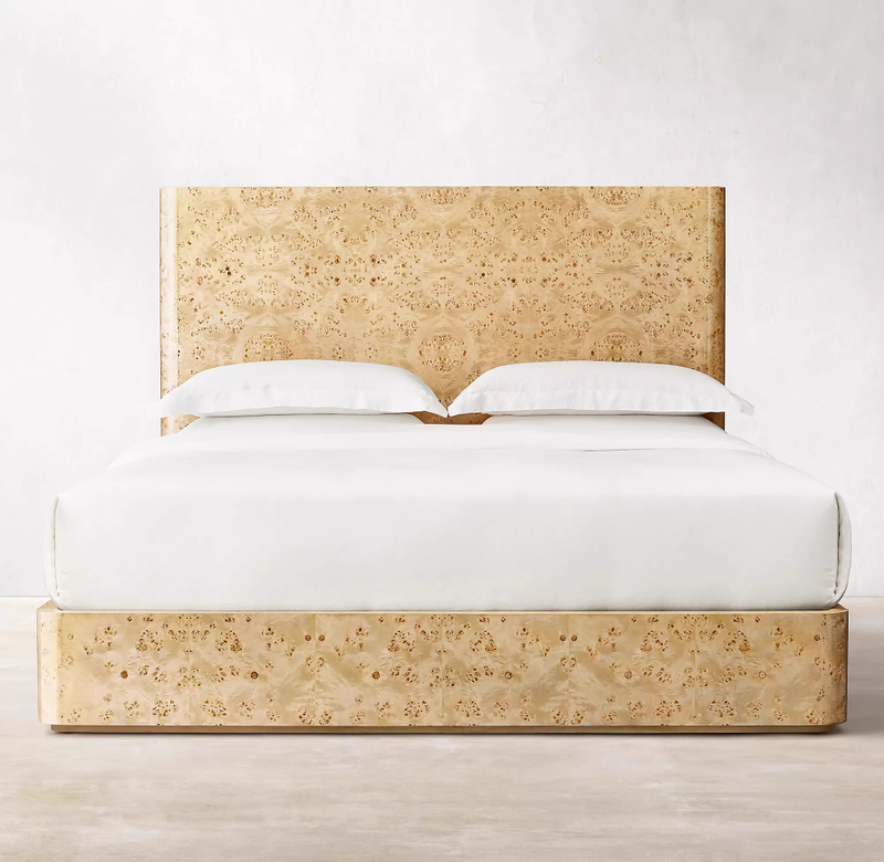 Folheado de madeira de Burl: as texturas naturalmente formadas e irregulares e os tons de ouro e de ouro escuro são como 'registros congelados das trajetórias de crescimento natural '. Eles infundiram a cama com o charme artístico irreproduzível, fazendo com que o 'luxo natural' 'o tom fundamental do estilo.