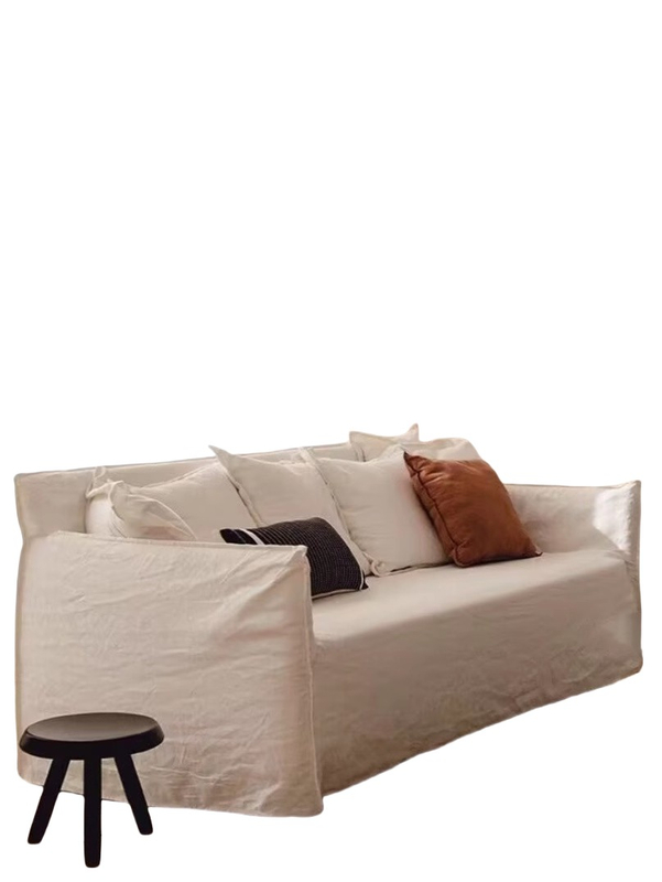 Este é um sofá de dois lugares de colorido leve com um estilo simples e confortável. Ele adota um design solto de capa deslizante e é feito de tecido branco, que possui uma cortina natural forte e mostra totalmente uma sensação de casualidade. O sofá é combinado com vários travesseiros de arremesso em cores, como branco, preto e marrom, enriquecendo a hierarquia visual.