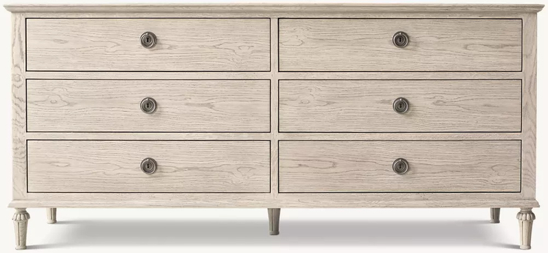 Cada uma das seis gavetas possui puxadores de metal de estilo antigo com acabamento em idade de idade. O hardware passa por um processo de várias etapas: fundido em latão, polido à mão e depois tratado quimicamente para criar uma aparência desgastada e patinada. Esses puxões não são apenas decorativos-eles são projetados ergonomicamente para fácil aderência e combinados com slides silenciosos de close macio, garantindo uma operação suave e silenciosa.