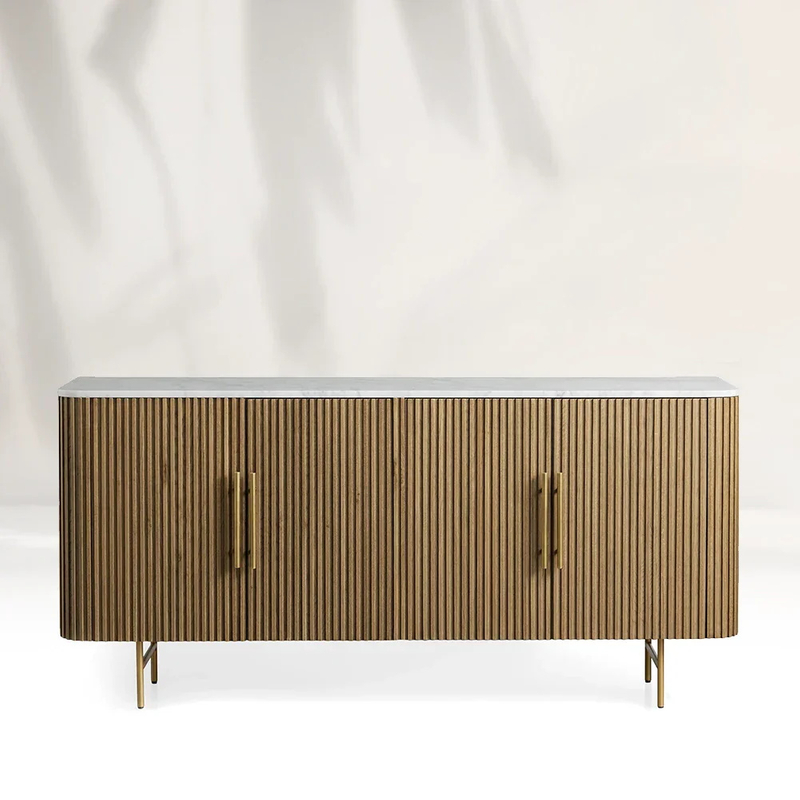 Este gabinete de TV de Oak White apresenta um topo criado de luxuoso mármore natural. O mármore, com seus padrões de veias únicos que se assemelham a córregos delicados serpenteando através de uma paisagem, acrescenta um ar de elegância e sofisticação. Cada laje é uma - de - A - gentil, garantindo que seu armário de TV seja realmente distinto. O toque frio e suave do mármore contrasta lindamente com a textura quente e granulada da base de carvalho branco, criando uma mistura harmoniosa de materiais. O top de mármore natural não serve apenas como um ponto focal impressionante, mas também oferece excelente resistência ao calor, tornando -o perfeito para colocar os dispositivos de mídia. É uma combinação que se casa com a funcionalidade com a estética alta e fina, aprimorando o charme geral da sua sala de estar.