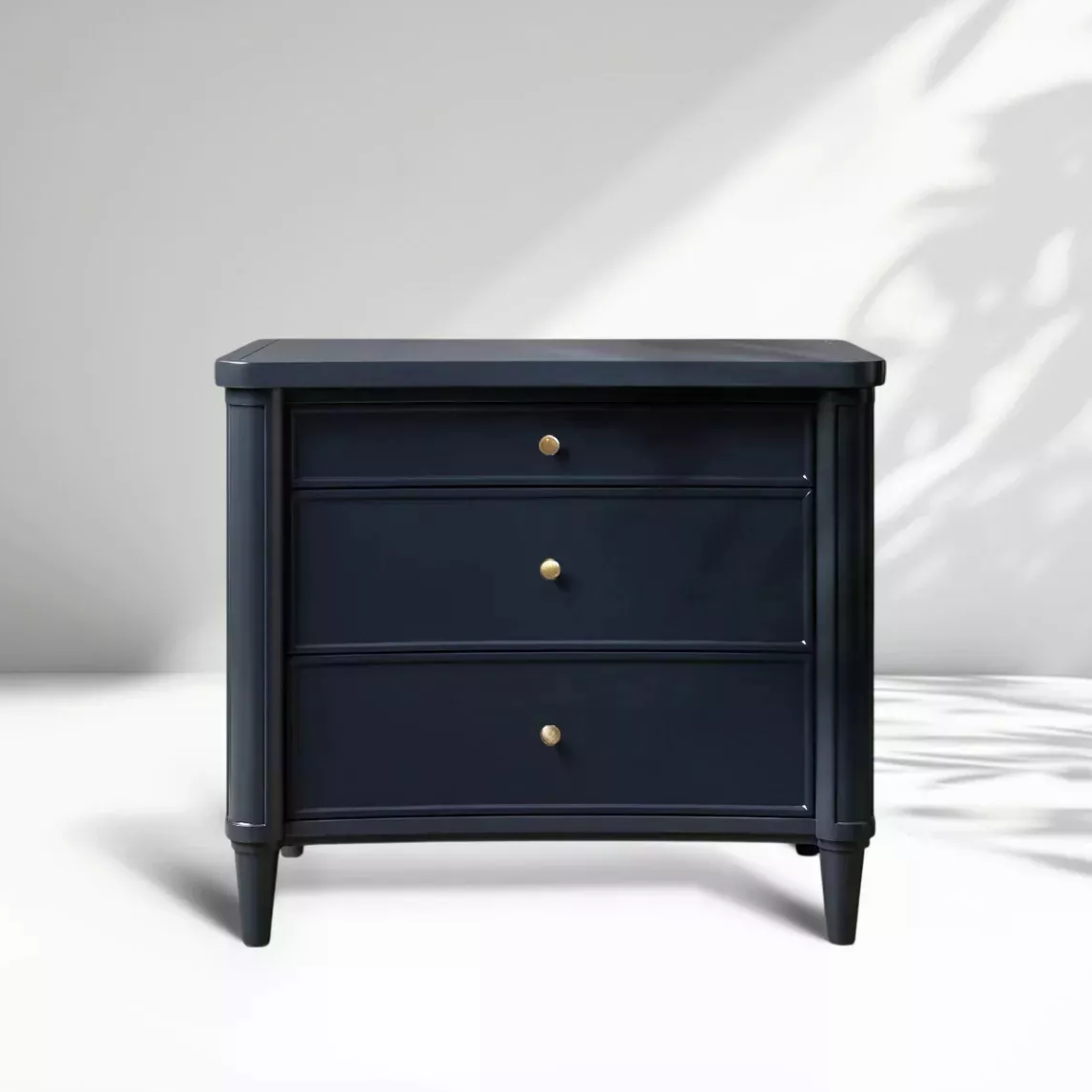 A mesa de cabeceira azul escura exala um charme único de nobreza e mistério. A rica e profunda cor azul escura combina a tranquilidade do azul com uma pitada de elegância misteriosa e nobre. O material de madeira sólida dá ao azul escuro uma sensação mais quente, não mais fria. Colocado no quarto, ele pode criar uma atmosfera elegante e nobre, como se estivesse criando um espaço privado exclusivo, permitindo que os ocupantes sintam uma sensação única de dignidade e conforto.